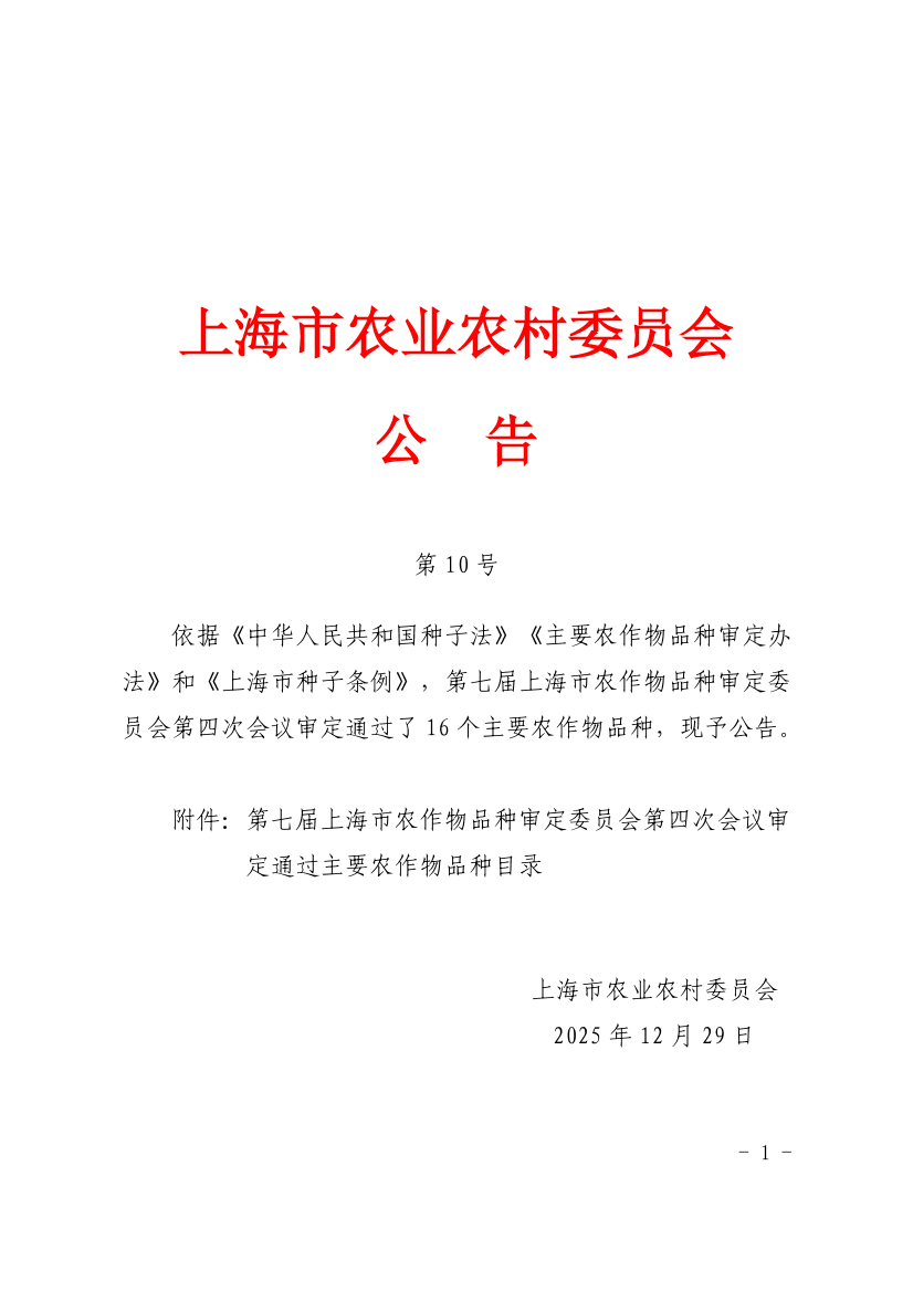 依据《中华人民共和国种子法》《主要农作物品种审定办法》和《上海市种子条例》,第七届上海市农作物品种审定委员会第四次会议审定通过了16个主要农作物品种,现予公告。