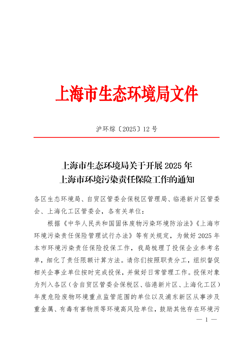 根据《中华人民共和国固体废物污染环境防治法》《上海市环境污染责任保险管理试行办法》等有关规定,为做好2025年本市环境污染责任保险投保工作,我局梳理了投保企业参考名单,细化了责任限额计算方法。请你们按照职责分工,组织督促相关企事业单位按时完成投保,并做好日常管理工作。投保对象为列入各区(含自贸区管委会保税区、临港新片区、上海化工区)年度危险废物环境重点监管范围的单位以及浦东新区从事涉及重金属、有毒有害物质等环境高风险单位,鼓励其他存在环境污染风险的企事业单位投保环境污染责任保险。