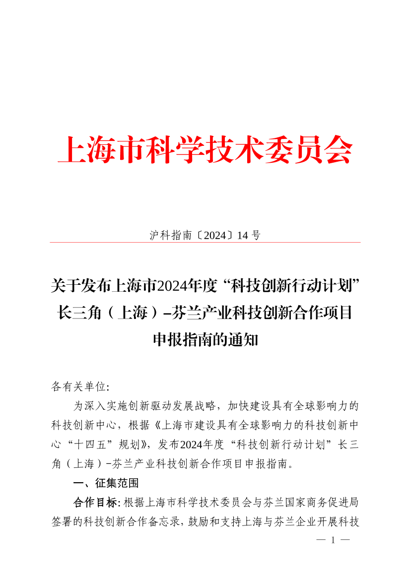 为深入实施创新驱动发展战略,加快建设具有全球影响力的科技创新中心,根据《上海市建设具有全球影响力的科技创新中心“十四五”规划》,发布2024年度“科技创新行动计划”长三角(上海)-芬兰产业科技创新合作项目申报指南。