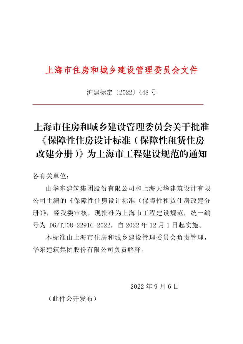由华东建筑集团股份有限公司和上海天华建筑设计有限公司主编的《保障性住房设计标准(保障性租赁住房改建分册)》,经我委审核,现批准为上海市工程建设规范,统一编号为 DG/TJ08-2291C-2022,自2022年12月1日起实施。
