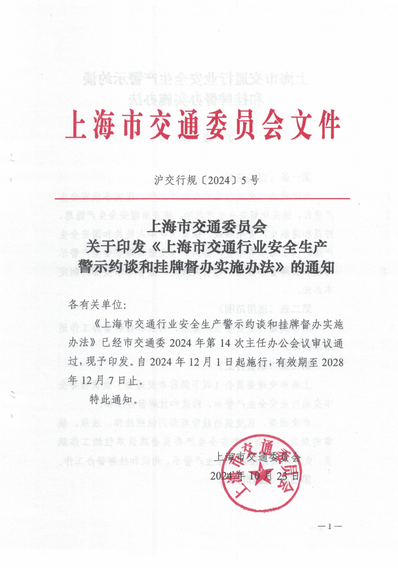 《上海市交通行业安全生产警示约谈和挂牌督办实施办法》已经市交通委2024年第14次主任办公会议审议通过,现予印发。自2024年12月1日起施行,有效期至2028年12月7日止。
