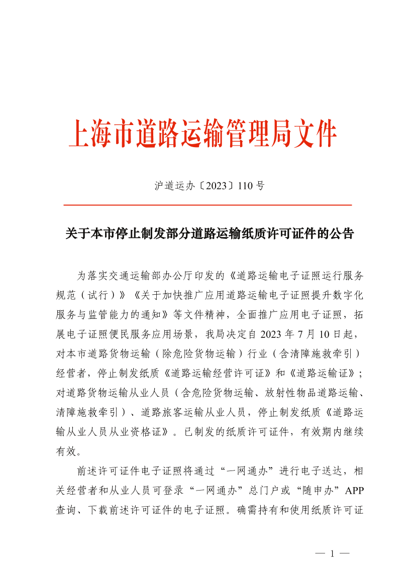 为落实交通运输部办公厅印发的《道路运输电子证照运行服务规范(试行)》《关于加快推广应用道路运输电子证照提升数字化服务与监管能力的通知》等文件精神,全面推广应用电子证照,拓展电子证照便民服务应用场景,我局决定自2023年7月10日起,对本市道路货物运输(除危险货物运输)行业(含清障施救牵引)经营者,停止制发纸质《道路运输经营许可证》和《道路运输证》;对道路货物运输从业人员(含危险货物运输、放射性物品道路运输、清障施救牵引)、道路旅客运输从业人员,停止制发纸质《道路运输从业人员从业资格证》。已制发的纸质许可证件,有效期内继续有效。