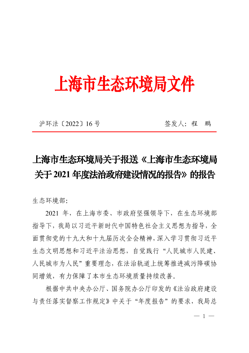 上海市生态环境局关于2021年度法治政府建设情况的报告