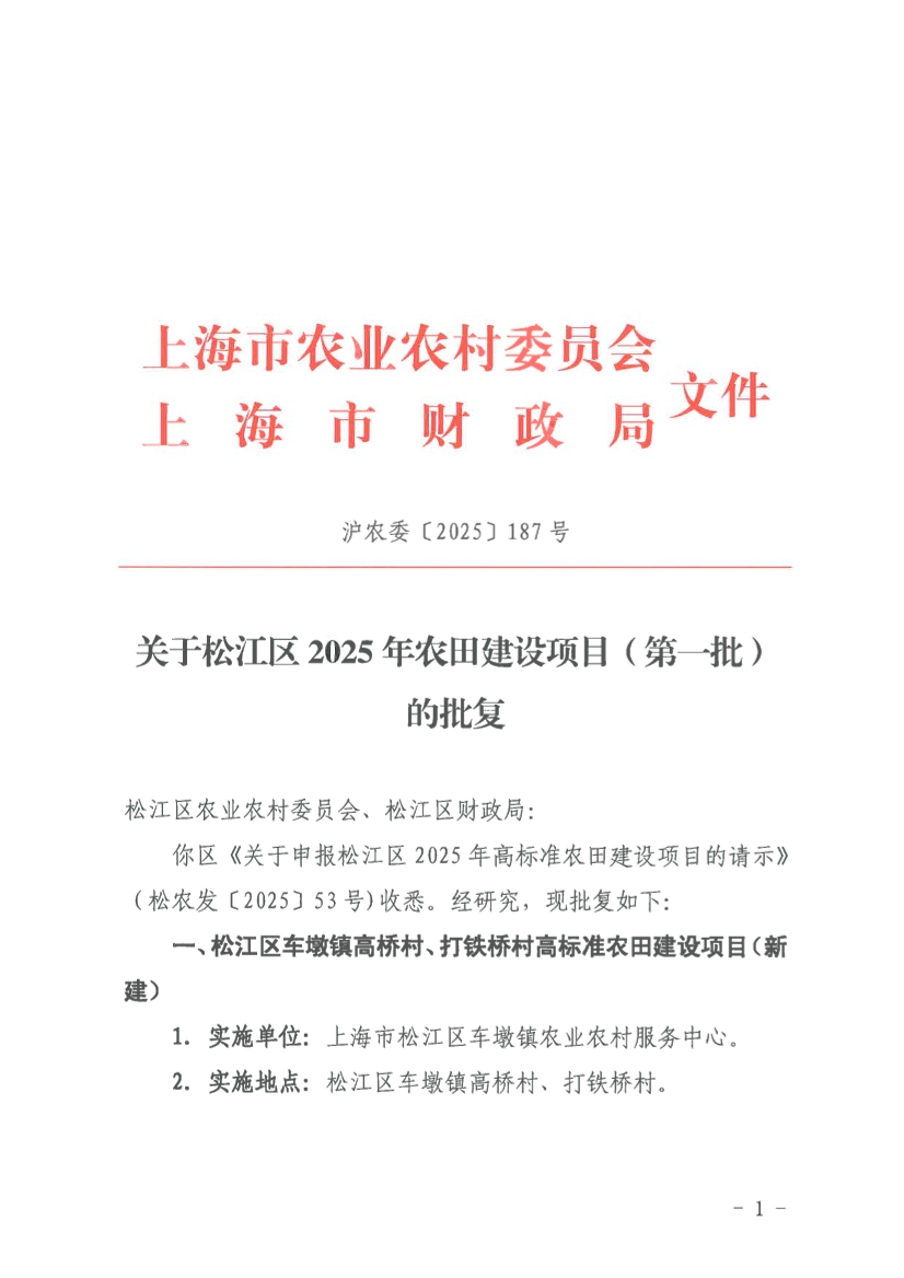 你区《关于申报松江区2025年高标准农田建设项目的请示》(松农发〔2025〕53号)收悉。经研究,现批复如下: