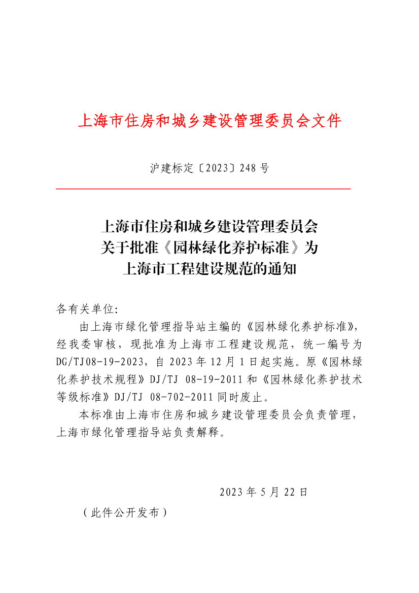 由上海市绿化管理指导站主编的《园林绿化养护标准》,经我委审核,现批准为上海市工程建设规范,统一编号为 DG/TJ08-19-2023,自2023年12月1日起实施。原《园林绿化养护技术规程》DJ/TJ 08-19-2011和《园林绿化养护技术等级标准》DJ/TJ 08-702-2011同时废止。