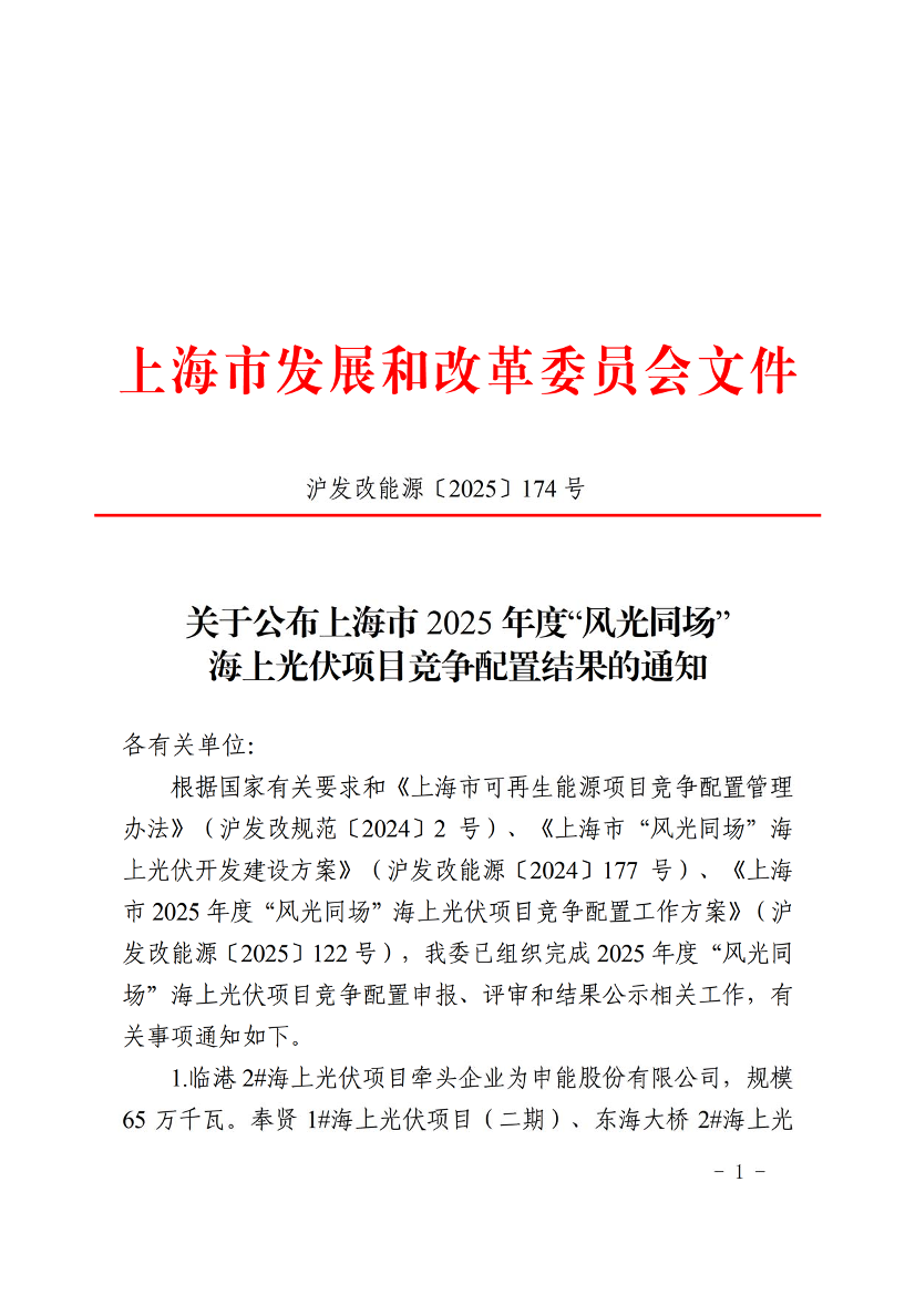 根据国家有关要求和《上海市可再生能源项目竞争配置管理办法》(沪发改规范〔2024〕2号)、《上海市“风光同场”海上光伏开发建设方案》(沪发改能源〔2024〕177号)、《上海市2025年度“风光同场”海上光伏项目竞争配置工作方案》(沪发改能源〔2025〕122号),我委已组织完成2025年度“风光同场”海上光伏项目竞争配置申报、评审和结果公示相关工作,有关事项通知如下。