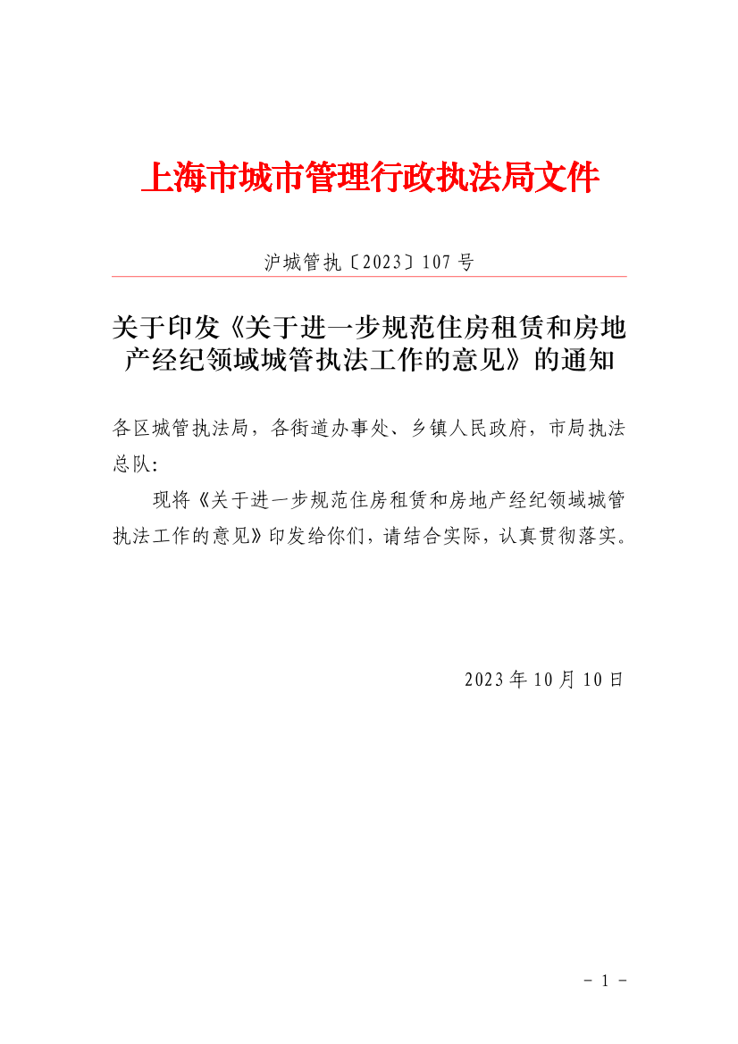 为落实《上海市城市管理行政执法局关于持续优化营商环境的若干措施》,进一步做好住房租赁和房地产经纪领域城管执法工作,推进行政检查、行政处罚等执法行为规范有序实施,维护好市场主体合法权益,现提出以下工作意见。