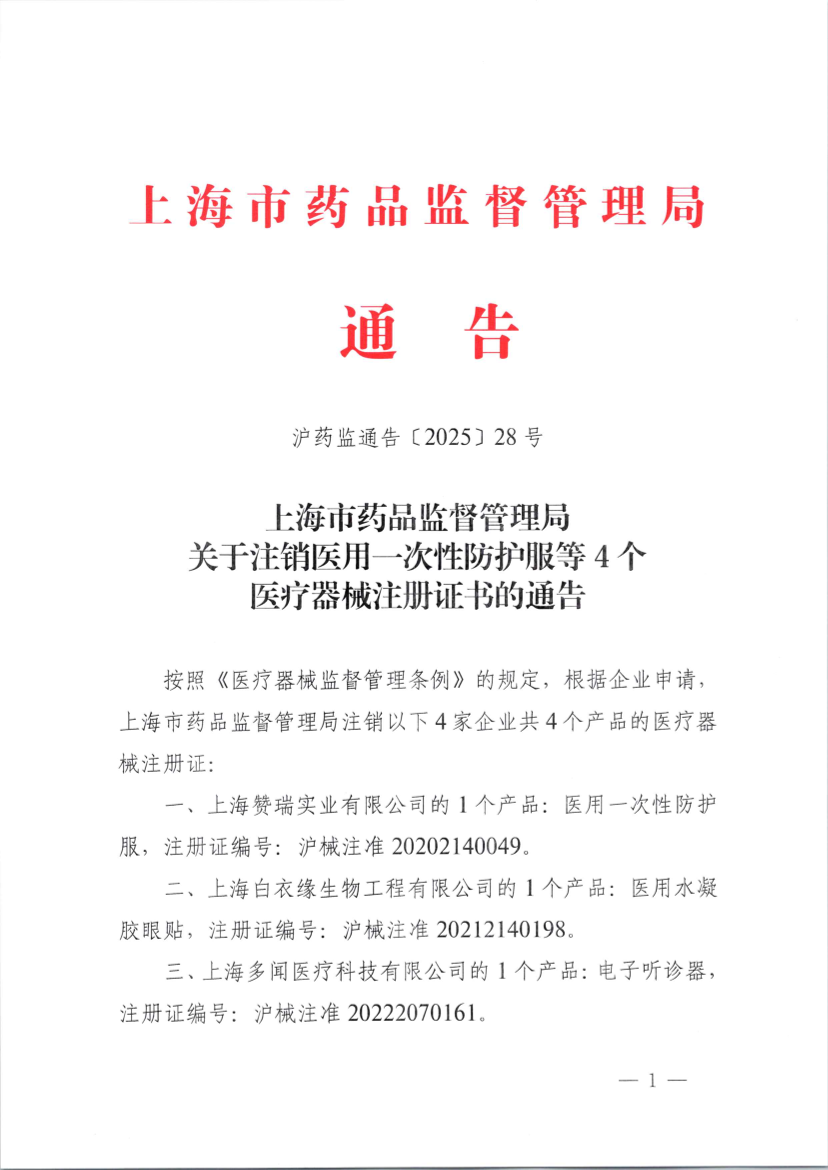 一、上海赞瑞实业有限公司的1个产品:医用一次性防护服,注册证编号:沪械注准20202140049。