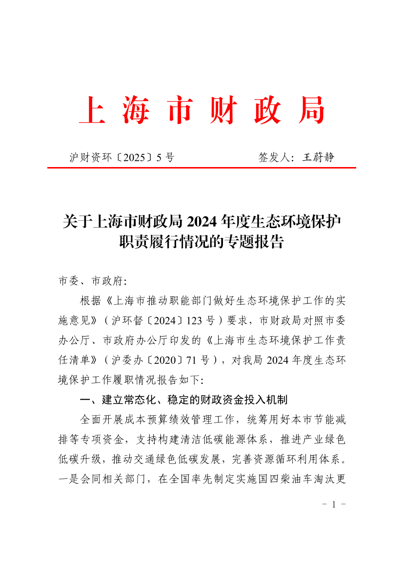 根据《上海市推动职能部门做好生态环境保护工作的实施意见》(沪环督〔2024〕123号)要求,市财政局对照市委办公厅、市政府办公厅印发的《上海市生态环境保护工作责任清单》(沪委办〔2020〕71号),对我局2024年度生态环境保护工作履职情况报告如下: