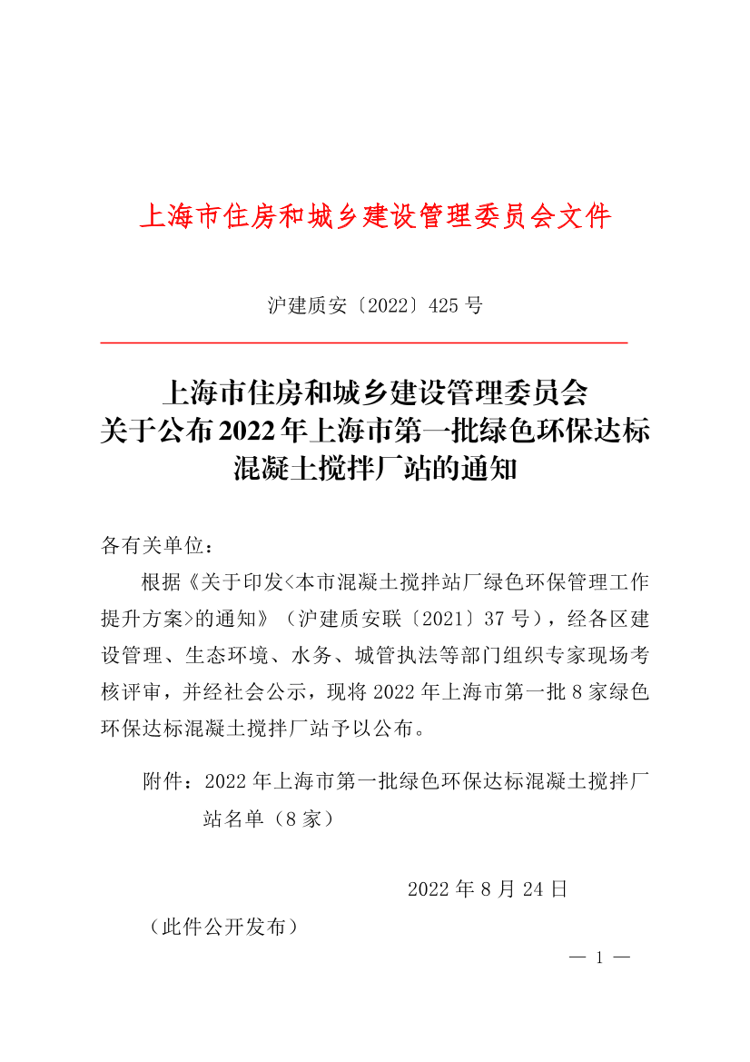 关于公布2022年上海市第一批绿色环保达标混凝土搅拌厂站的通知