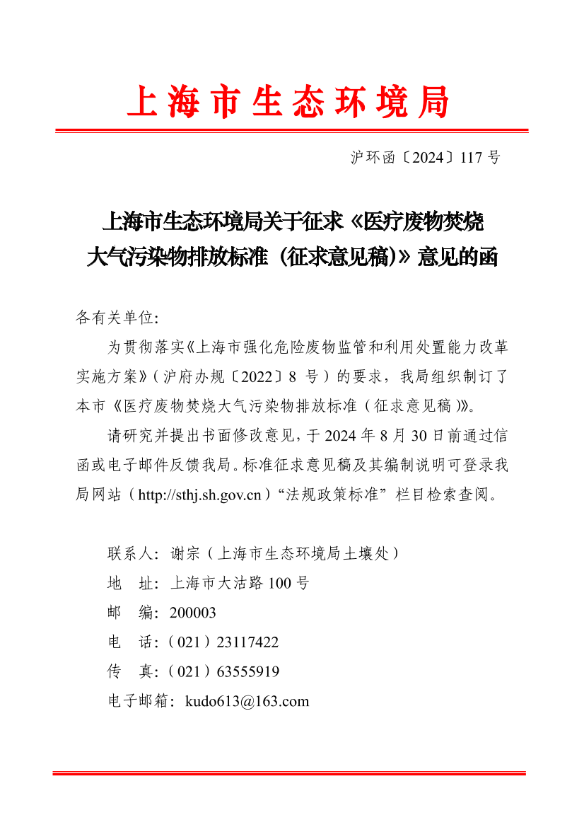 请研究并提出书面修改意见,于2024年8月30日前通过信函或电子邮件反馈我局。标准征求意见稿及其编制说明可登录我局网站(http://sthj.sh.gov.cn)“法规政策标准”栏目检索查阅。