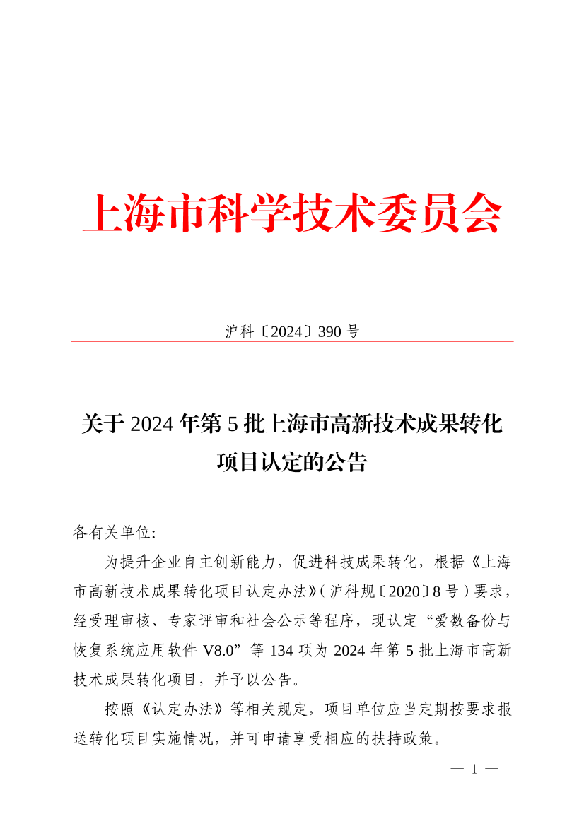 为提升企业自主创新能力,促进科技成果转化,根据《上海市高新技术成果转化项目认定办法》(沪科规〔2020〕8号)要求,经受理审核、专家评审和社会公示等程序,现认定“爱数备份与恢复系统应用软件V8.0”等134项为2024年第5批上海市高新技术成果转化项目,并予以公告。