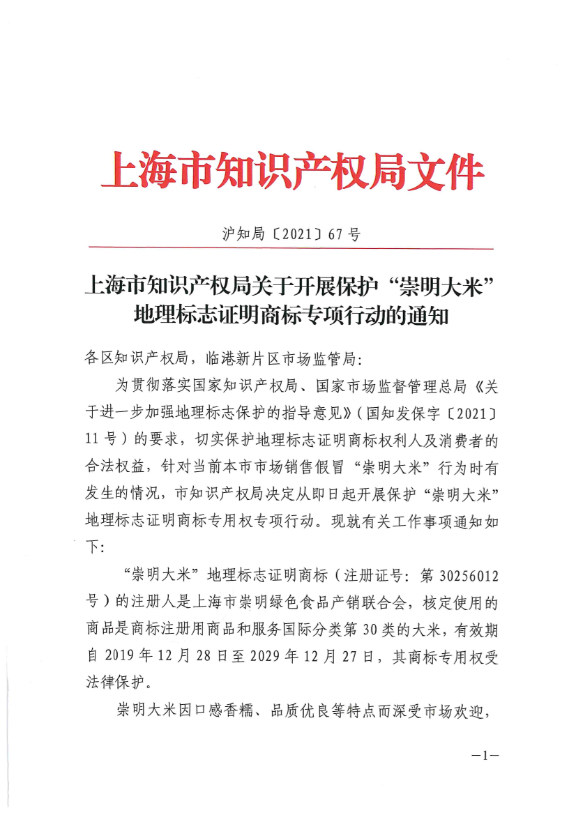 为贯彻落实国家知识产权局、国家市场监督管理总局《关于进一步加强地理标志保护的指导意见》(国知发保字〔2021〕11号)的要求,切实保护地理标志证明商标权利人及消费者的合法权益,针对当前本市市场销售假冒“崇明大米”行为时有发生的情况,市知识产权局决定从即日起开展保护“崇明大米”地理标志证明商标专用权专项行动。现就有关工作事项通知如下:
