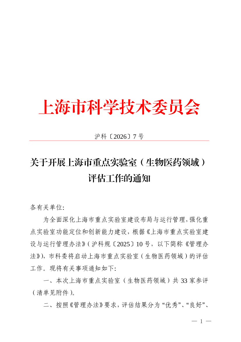 为全面深化上海市重点实验室建设布局与运行管理,强化重点实验室功能定位和创新能力建设,根据《上海市重点实验室建设与运行管理办法》(沪科规〔2025〕10号,以下简称《管理办法》),市科委将启动上海市重点实验室(生物医药领域)的评估工作。现将有关事项通知如下: