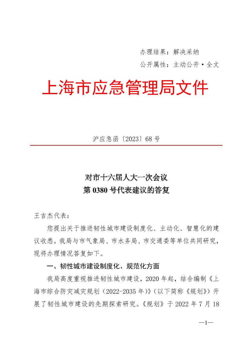 您提出关于推进韧性城市建设制度化、主动化、智慧化的建议收悉。我局与市气象局、市水务局、市交通委等单位共同研究,现将办理情况答复如下。