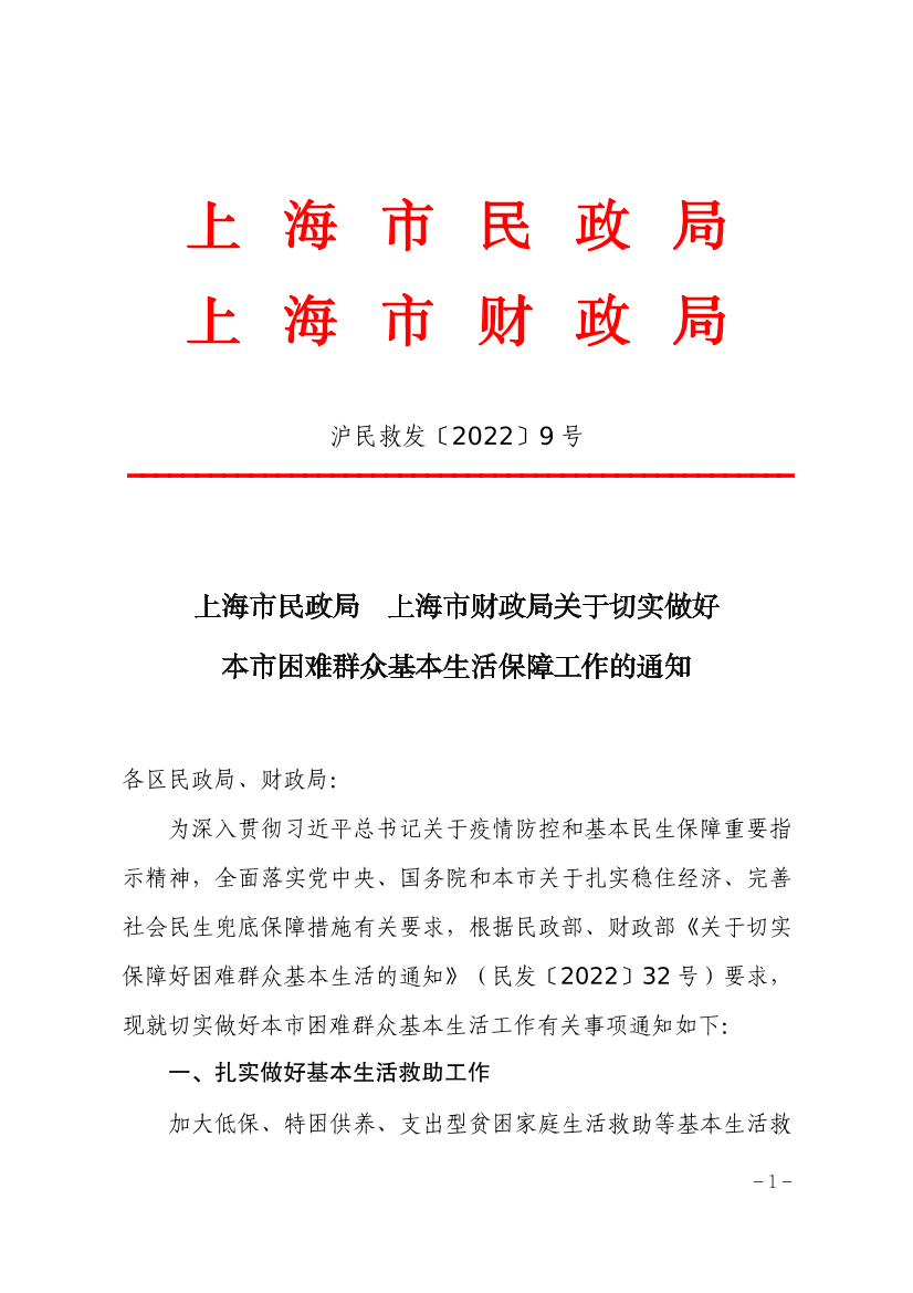 为深入贯彻习近平总书记关于疫情防控和基本民生保障重要指示精神,全面落实党中央、国务院和本市关于扎实稳住经济、完善社会民生兜底保障措施有关要求,根据民政部、财政部《关于切实保障好困难群众基本生活的通知》(民发〔2022〕32号)要求,现就切实做好本市困难群众基本生活工作有关事项通知如下: