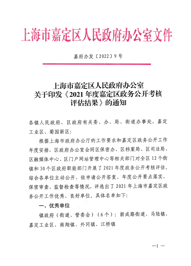 根据上海市政府办公厅的工作要求和嘉定区政务公开工作年度安排,区政府办公室会同区保密办、区档案局、区司法局、区融媒体中心、区门户网站管理中心等相关部门对全区12个街镇和30个区政府职能部门开展了2021年度政务公开考核评估。综合各单位主动公开、依申请公开答复、年度公开要点落实、保密审查、监督检查等情况,评选出了2021年上海市嘉定区政务公开工作优秀、良好单位。具体名单如下:
