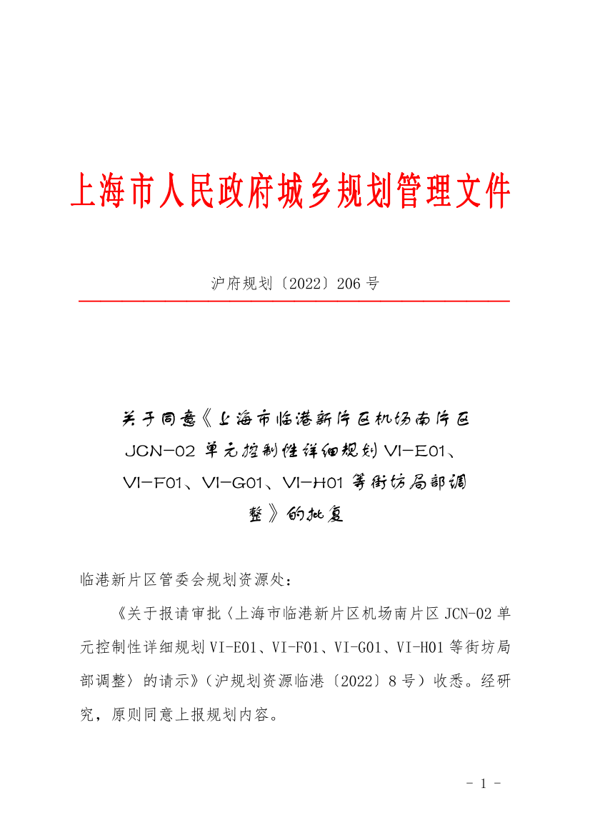 关于同意《上海市临港新片区机场南片区JCN-02单元控制性详细规划VI-E01、VI-F01、VI-G01、VI-H01等街坊局部调整》的批复