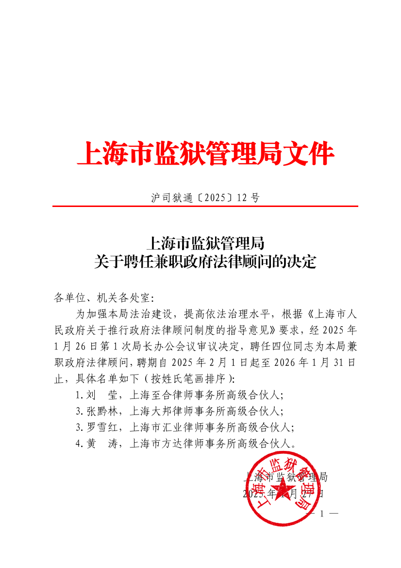 上海市监狱管理局关于聘任兼职政府法律顾问的决定