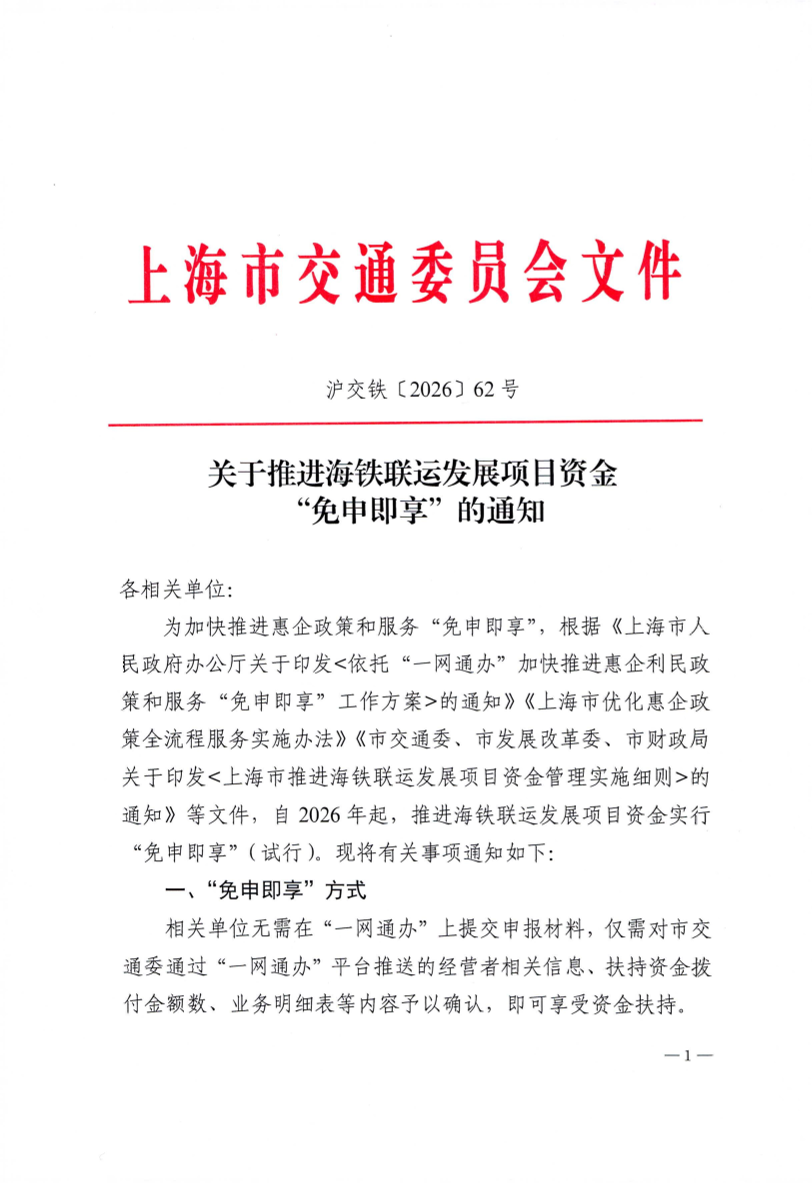 为加快推进惠企政策和服务“免申即享”,根据《上海市人民政府办公厅关于印发<依托“一网通办”加快推进惠企利民政策和服务“免申即享”工作方案>的通知》《上海市优化惠企政策全流程服务实施办法》《市交通委、市发展改革委、市财政局关于印发<上海市推进海铁联运发展项目资金管理实施细则>的通知》等文件,自2026年起,推进海铁联运发展项目资金实行“免申即享”(试行)。现将有关事项通知如下: