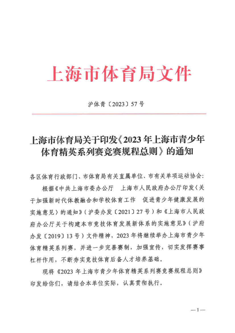 为深入贯彻落实《中共上海市委办公厅 上海市人民政府办公厅印发〈关于加强新时代体教融合和学校体育工作 促进青少年健康发展的实施意见〉的通知》(沪委办发〔2021〕27号)和《上海市人民政府办公厅关于构建本市竞技体育发展新体系的实施意见》(沪府办发〔2019〕13号)文件精神,推动本市重点项目发展,引导各区项目布局,拓宽竞赛参与群体,持续优化竞赛机制,促进优秀后备人才脱颖而出,特举办2023年上海市青少年体育精英系列赛。