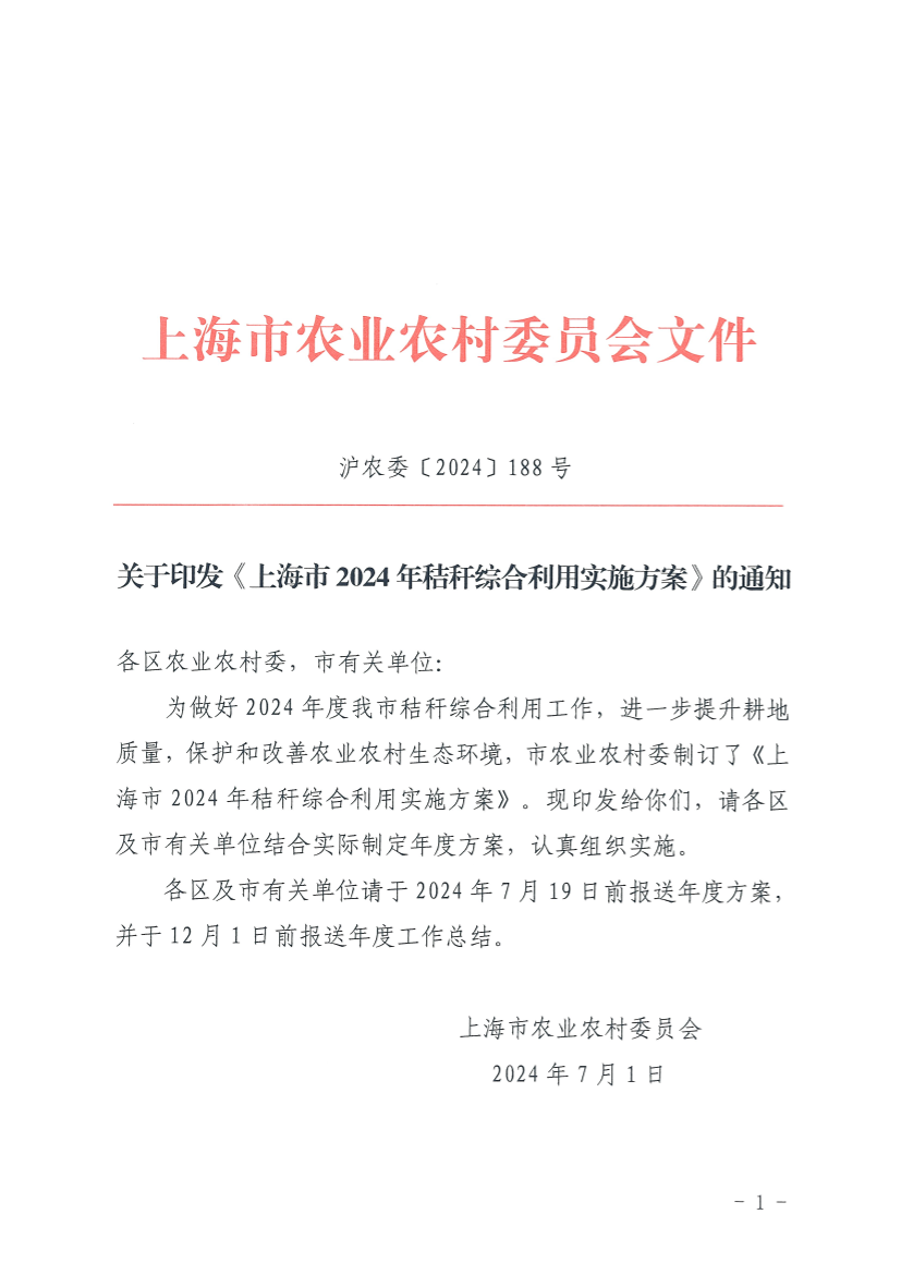 为做好2024年度我市秸秆综合利用工作,进一步提升耕地质量,保护和改善农业农村生态环境,市农业农村委制订了《上海市2024年秸秆综合利用实施方案》。现印发给你们,请各区及市有关单位结合实际制定年度方案,认真组织实施。