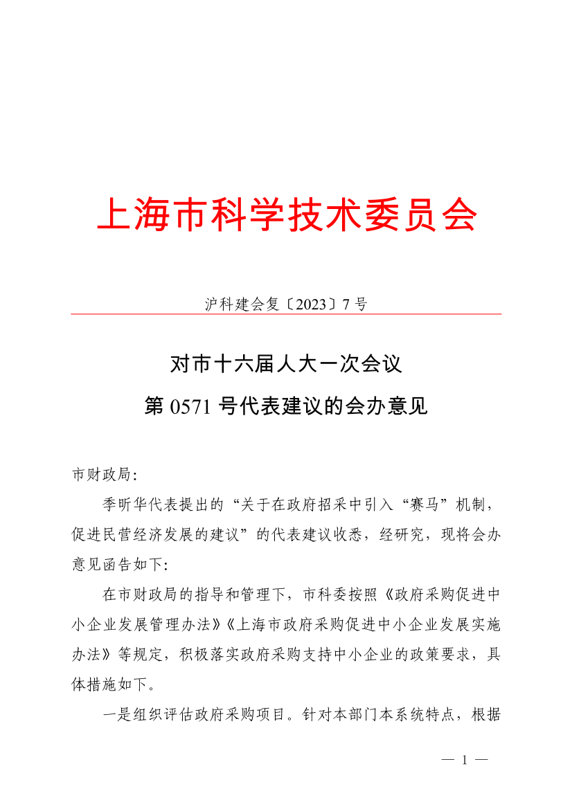 季昕华代表提出的“关于在政府招采中引入“赛马”机制,促进民营经济发展的建议”的代表建议收悉,经研究,现将会办意见函告如下: