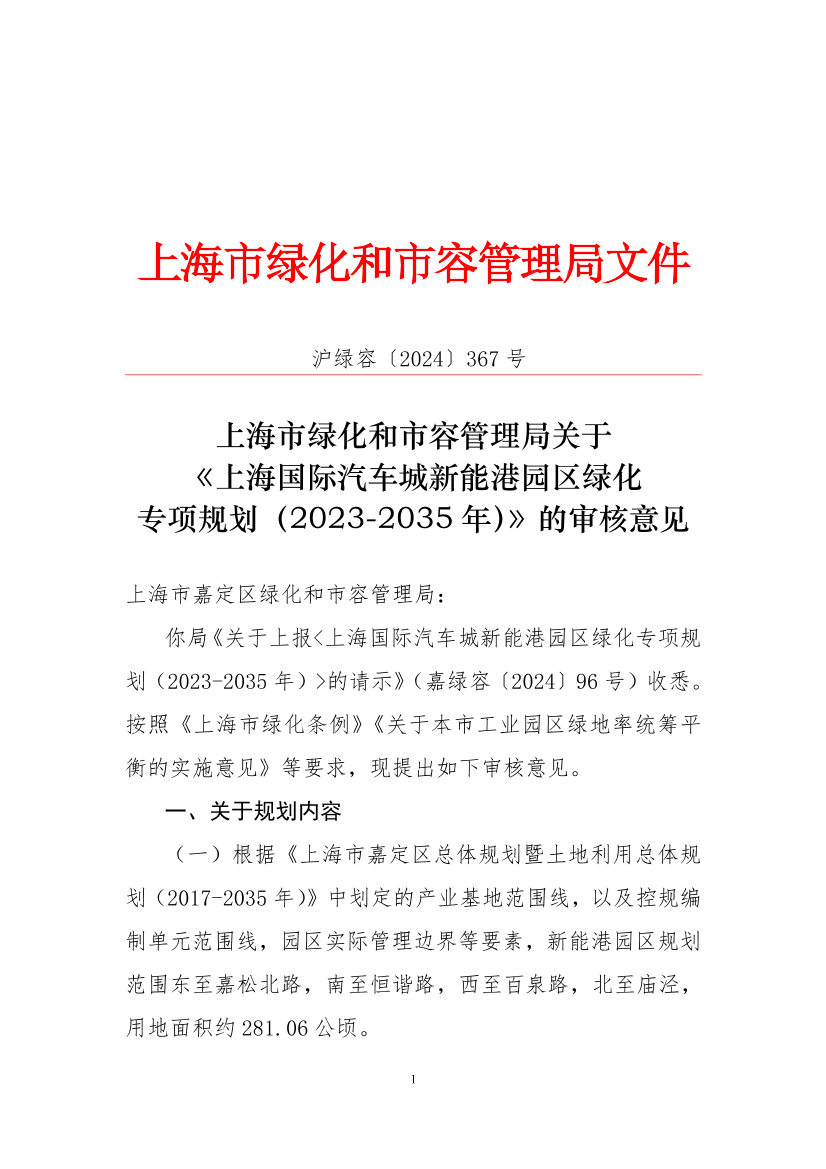 你局《关于上报<上海国际汽车城新能港园区绿化专项规划(2023-2035年)>的请示》(嘉绿容〔2024〕96号)收悉。按照《上海市绿化条例》《关于本市工业园区绿地率统筹平衡的实施意见》等要求,现提出如下审核意见。