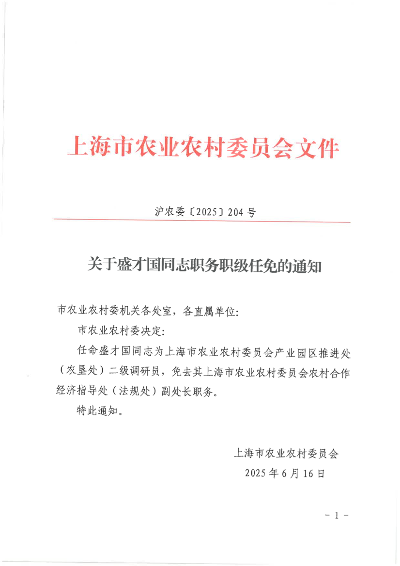 任命盛才国同志为上海市农业农村委员会产业园区推进处(农垦处)二级调研员,免去其上海市农业农村委员会农村合作经济指导处(法规处)副处长职务。