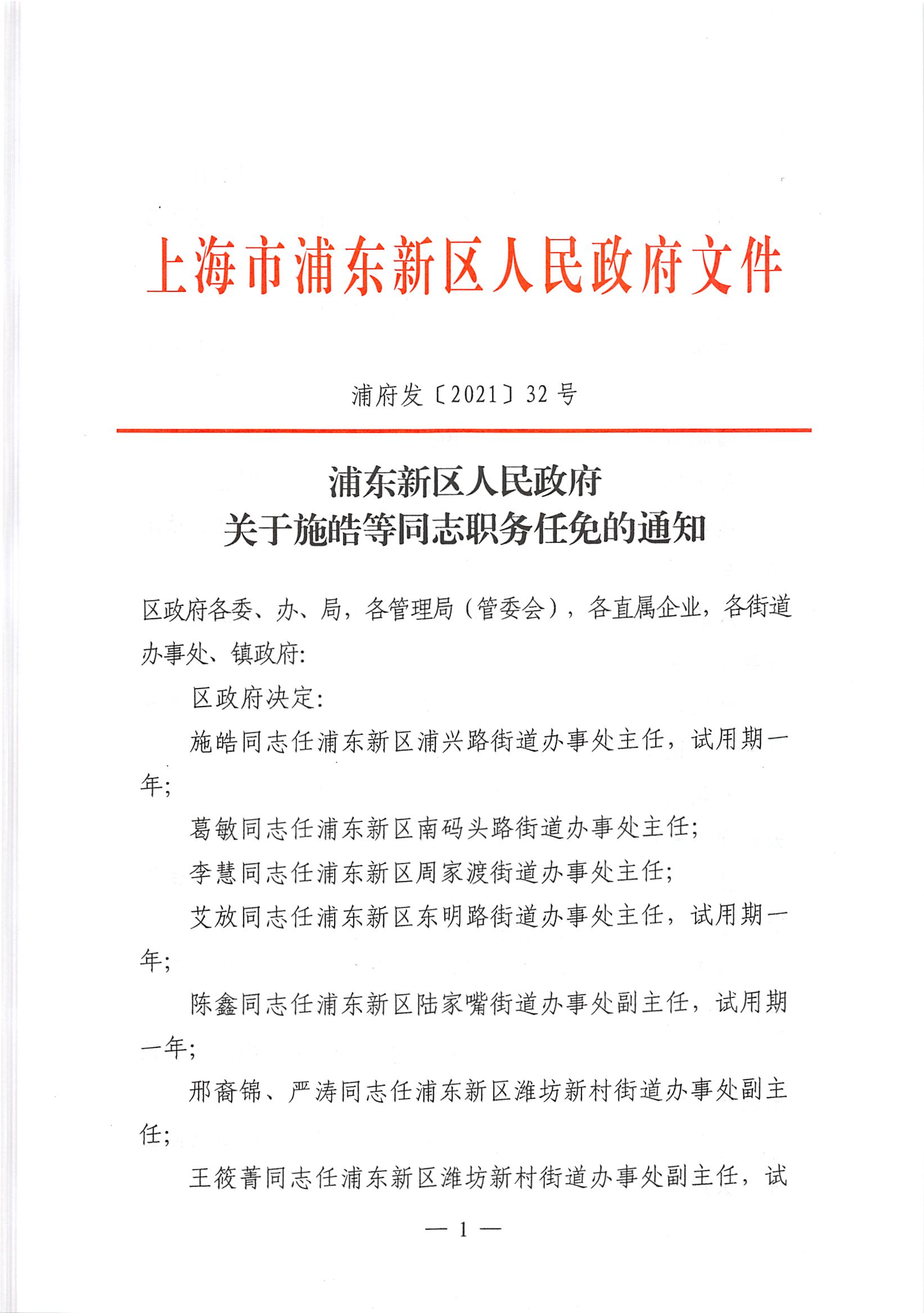 施皓同志任浦东新区浦兴路街道办事处主任,试用期一年;