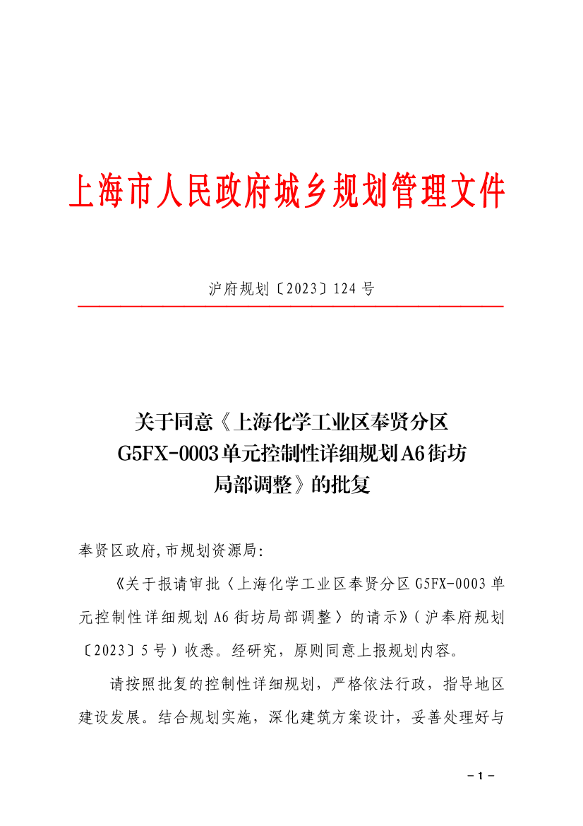 《关于报请审批〈上海化学工业区奉贤分区G5FX-0003单元控制性详细规划A6街坊局部调整〉的请示》(沪奉府规划〔2023〕5号)收悉。经研究,原则同意上报规划内容。