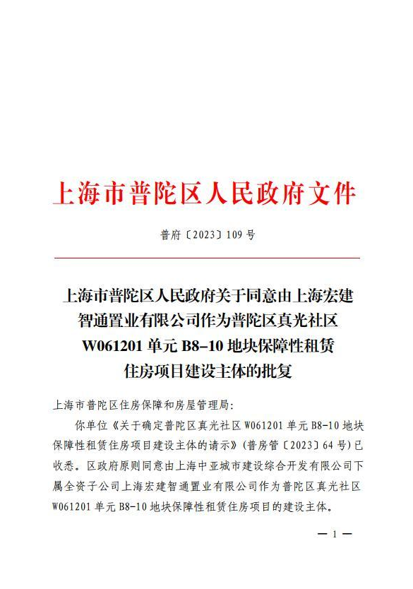 你单位《关于确定普陀区真光社区W061201单元B8-10地块保障性租赁住房项目建设主体的请示》(普房管〔2023〕64号)已收悉。区政府原则同意由上海中亚城市建设综合开发有限公司下属全资子公司上海宏建智通置业有限公司作为普陀区真光社区W061201单元B8-10地块保障性租赁住房项目的建设主体。