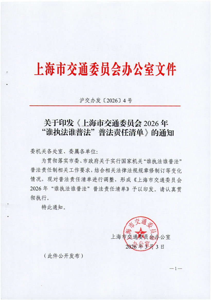 为贯彻落实市委、市政府关于实行国家机关“谁执法谁普法”普法责任制相关工作要求,结合相关法律法规规章修制订等变化情况,现对普法责任清单进行调整,形成《上海市交通委员会2026年“谁执法谁普法”普法责任清单》予以印发。请认真贯彻执行。
