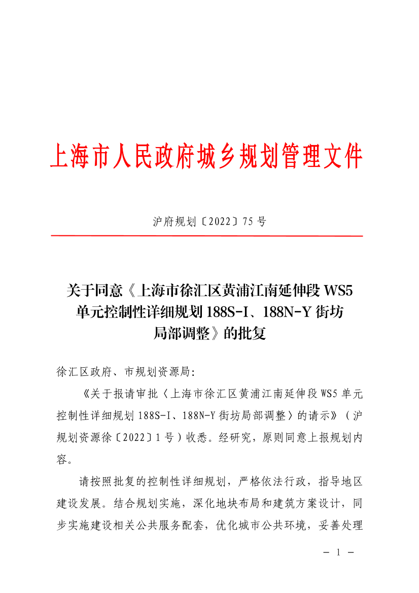 《关于报请审批〈上海市徐汇区黄浦江南延伸段WS5单元控制性详细规划188S-I、188N-Y街坊局部调整〉的请示》(沪规划资源徐〔2022〕1号)收悉。经研究,原则同意上报规划内容。