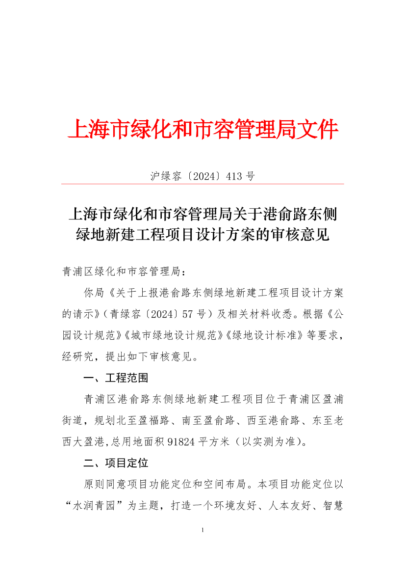 你局《关于上报港俞路东侧绿地新建工程项目设计方案的请示》(青绿容〔2024〕57号)及相关材料收悉。根据《公园设计规范》《城市绿地设计规范》《绿地设计标准》等要求,经研究,提出如下审核意见。