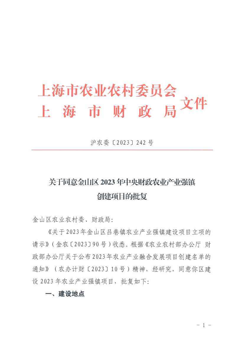 《关于2023年金山区吕巷镇农业产业强镇建设项目立项的请示》(金农〔2023〕90号)收悉。根据《农业农村部办公厅 财政部办公厅关于公布2023年农业产业融合发展项目创建名单的通知》(农办计财〔2023〕10号)精神,经研究,同意你区建设2023年农业产业强镇项目,批复如下: