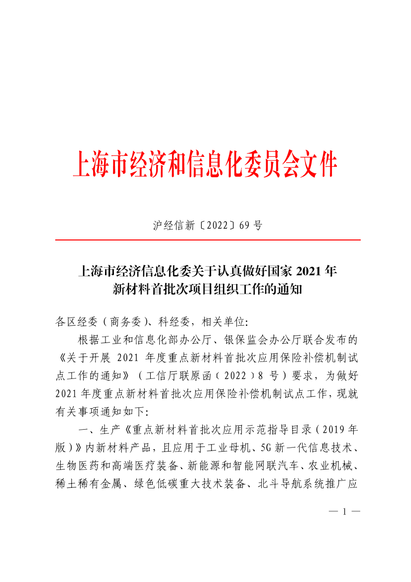 根据工业和信息化部办公厅、银保监会办公厅联合发布的《关于开展2021年度重点新材料首批次应用保险补偿机制试点工作的通知》(工信厅联原函﹝2022﹞8号)要求,为做好2021年度重点新材料首批次应用保险补偿机制试点工作,现就有关事项通知如下: