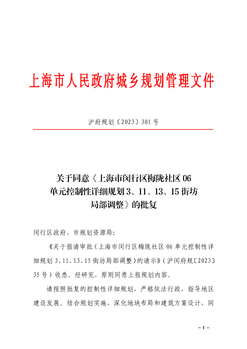 《关于报请审批〈上海市闵行区梅陇社区06单元控制性详细规划3、11、13、15街坊局部调整〉的请示》(沪闵府规〔2023〕35号)收悉。经研究,原则同意上报规划内容。