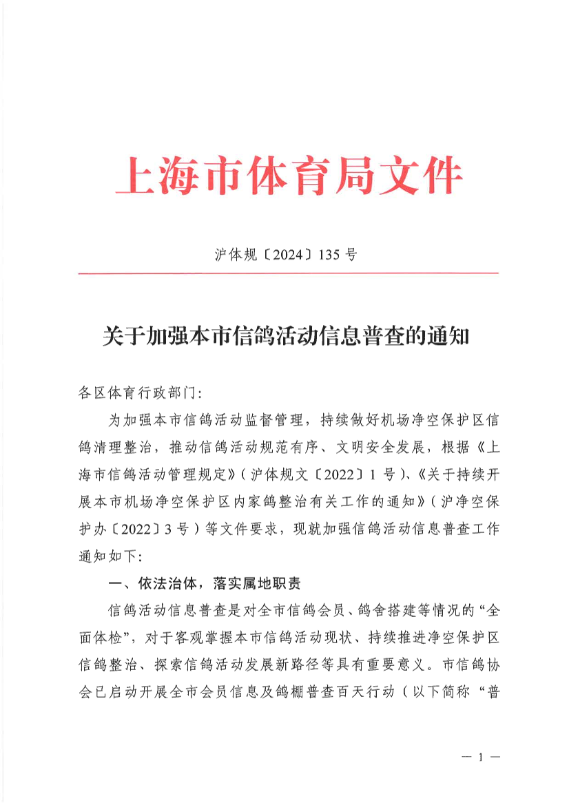 为加强本市信鸽活动监督管理,持续做好机场净空保护区信鸽清理整治,推动信鸽活动规范有序、文明安全发展,根据《上海市信鸽活动管理规定》(沪体规文〔2022〕1号)、《关于持续开展本市机场净空保护区内家鸽整治有关工作的通知》(沪净空保护办〔2022〕3号)等文件要求,现就加强信鸽活动信息普查工作通知如下:
