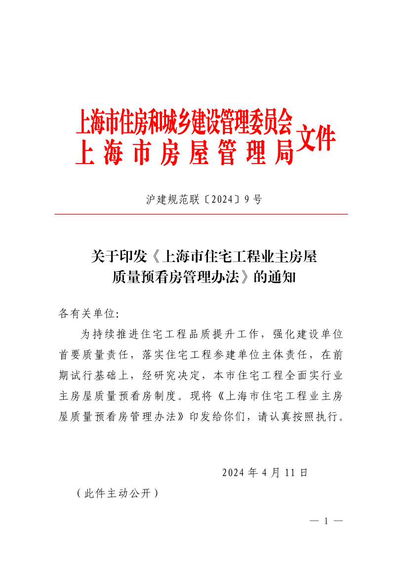 为持续推进住宅工程品质提升工作,强化建设单位首要质量责任,落实住宅工程参建单位主体责任,在前期试行基础上,经研究决定,本市住宅工程全面实行业主房屋质量预看房制度。现将《上海市住宅工程业主房屋质量预看房管理办法》印发给你们,请认真按照执行。
