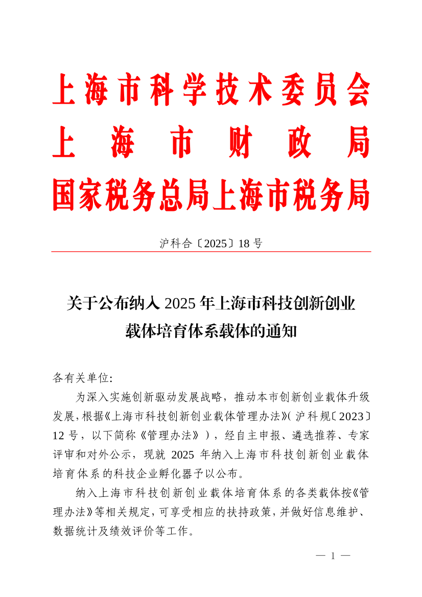 为深入实施创新驱动发展战略,推动本市创新创业载体升级发展,根据《上海市科技创新创业载体管理办法》(沪科规〔2023〕12号,以下简称《管理办法》),经自主申报、遴选推荐、专家评审和对外公示,现就2025年纳入上海市科技创新创业载体培育体系的科技企业孵化器予以公布。