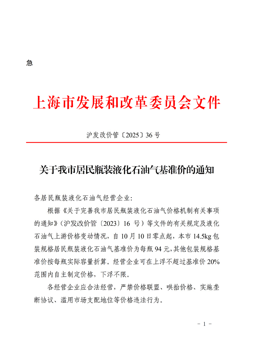 根据《关于完善我市居民瓶装液化石油气价格机制有关事项的通知》(沪发改价管〔2023〕16号)等文件的有关规定及液化石油气上游价格变动情况,自10月10日零点起,本市14.5kg包装规格居民瓶装液化石油气基准价为每瓶94元,其他包装规格基准价按每瓶实际容量折算。经营企业可在上浮不超过基准价20%范围内自主制定价格,下浮不限。