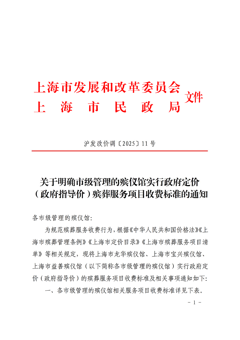 为规范殡葬服务收费行为,根据《中华人民共和国价格法》《上海市殡葬管理条例》《上海市定价目录》《上海市殡葬服务项目清单》等相关规定,现将上海市龙华殡仪馆、上海市宝兴殡仪馆、上海市益善殡仪馆(以下简称各市级管理的殡仪馆)实行政府定价(政府指导价)的殡葬服务项目收费标准及相关事项通知如下: