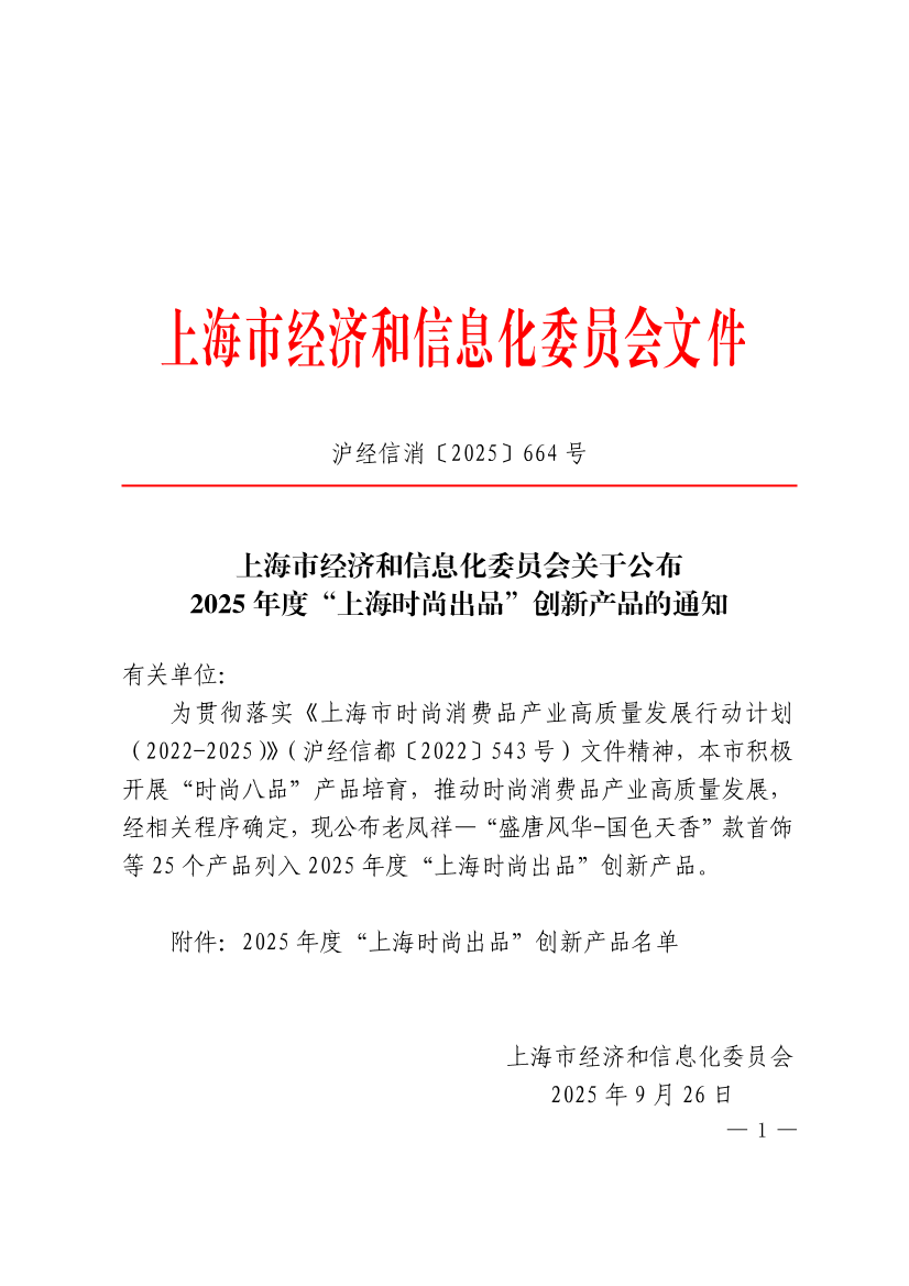 为贯彻落实《上海市时尚消费品产业高质量发展行动计划(2022-2025)》(沪经信都〔2022〕543号)文件精神,本市积极开展“时尚八品”产品培育,推动时尚消费品产业高质量发展,经相关程序确定,现公布老凤祥—“盛唐风华-国色天香”款首饰等25个产品列入2025年度“上海时尚出品”创新产品。