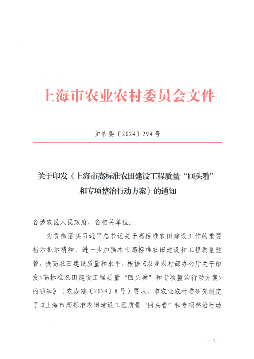 为贯彻落实习近平总书记关于高标准农田建设工作的重要指示批示精神,进一步加强本市高标准农田建设和工程质量监管,提高农田建设质量和水平,根据《农业农村部办公厅关于印发<高标准农田建设工程质量“回头看”和专项整治行动方案>的通知》(农办建〔2024〕8号)要求,市农业农村委研究制定了《上海市高标准农田建设工程质量“回头看”和专项整治行动方案》,经市领导同意,现印发你们,请认真抓好组织实施。