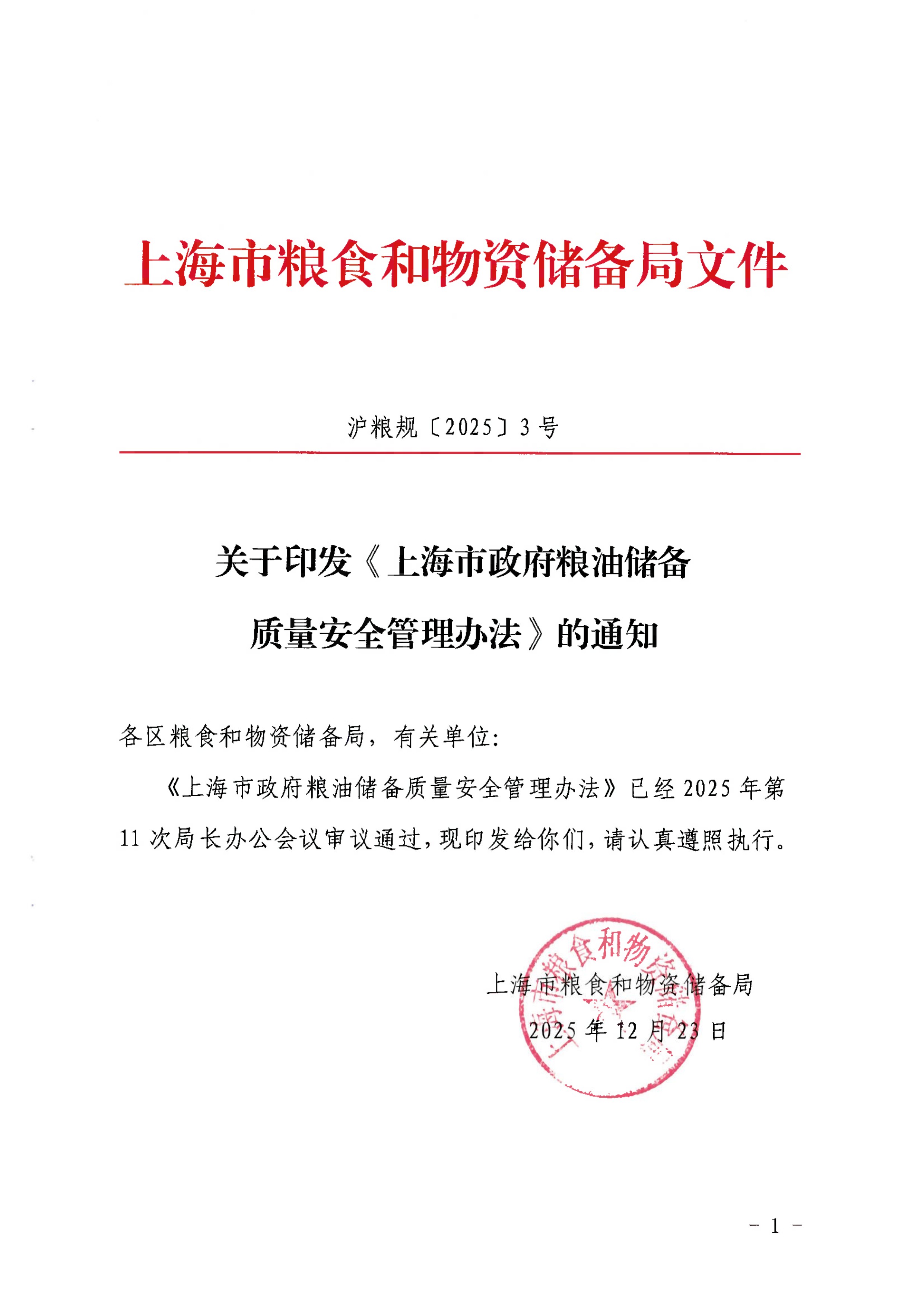 《上海市政府粮油储备质量安全管理办法》已经2025年第11次局长办公会议审议通过,现印发给你们,请认真遵照执行。