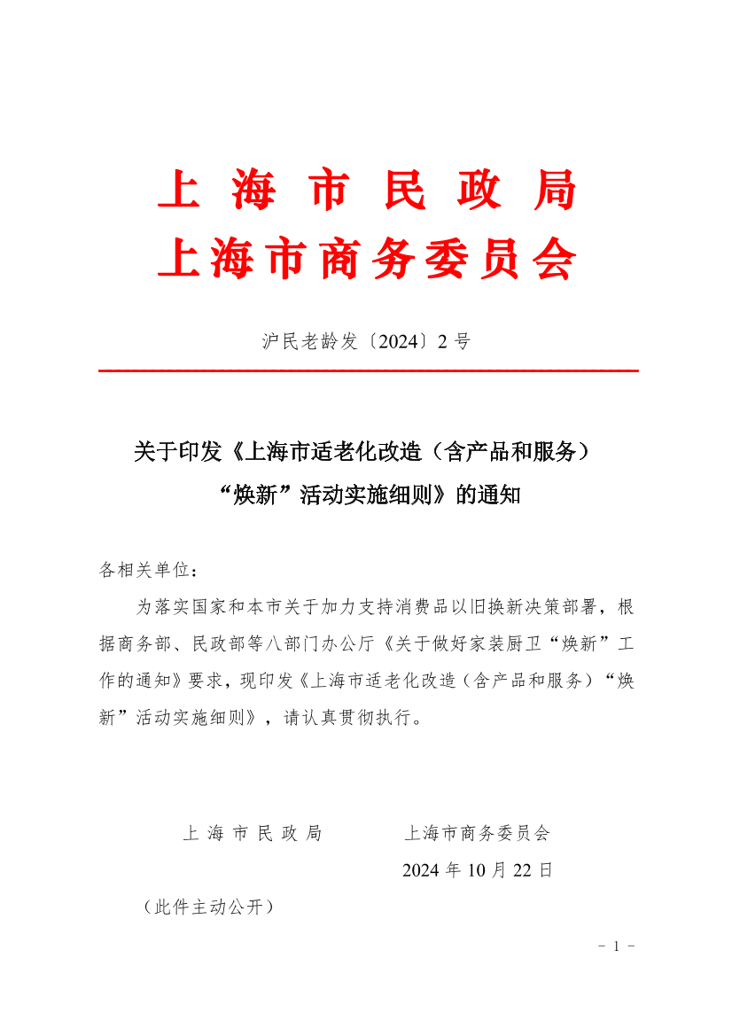 为落实国家和本市关于加力支持消费品以旧换新决策部署,根据商务部、民政部等八部门办公厅《关于做好家装厨卫“焕新”工作的通知》要求,制订本市适老化改造(含产品和服务)“焕新”(以下简称“焕新”)活动实施细则如下: