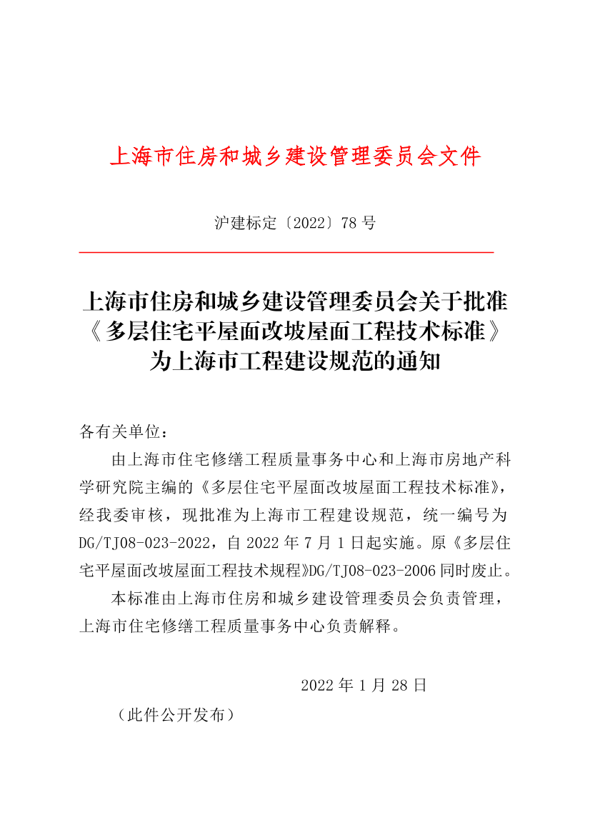 由上海市住宅修缮工程质量事务中心和上海市房地产科 学研究院主编的《多层住宅平屋面改坡屋面工程技术标准》, 经我委审核,现批准为上海市工程建设规范,统一编号为 DG/TJ08-023-2022,自 2022 年 7 月 1 日起实施。原《多层住 宅平屋面改坡屋面工程技术规程》DG/TJ08-023-2006 同时废止。