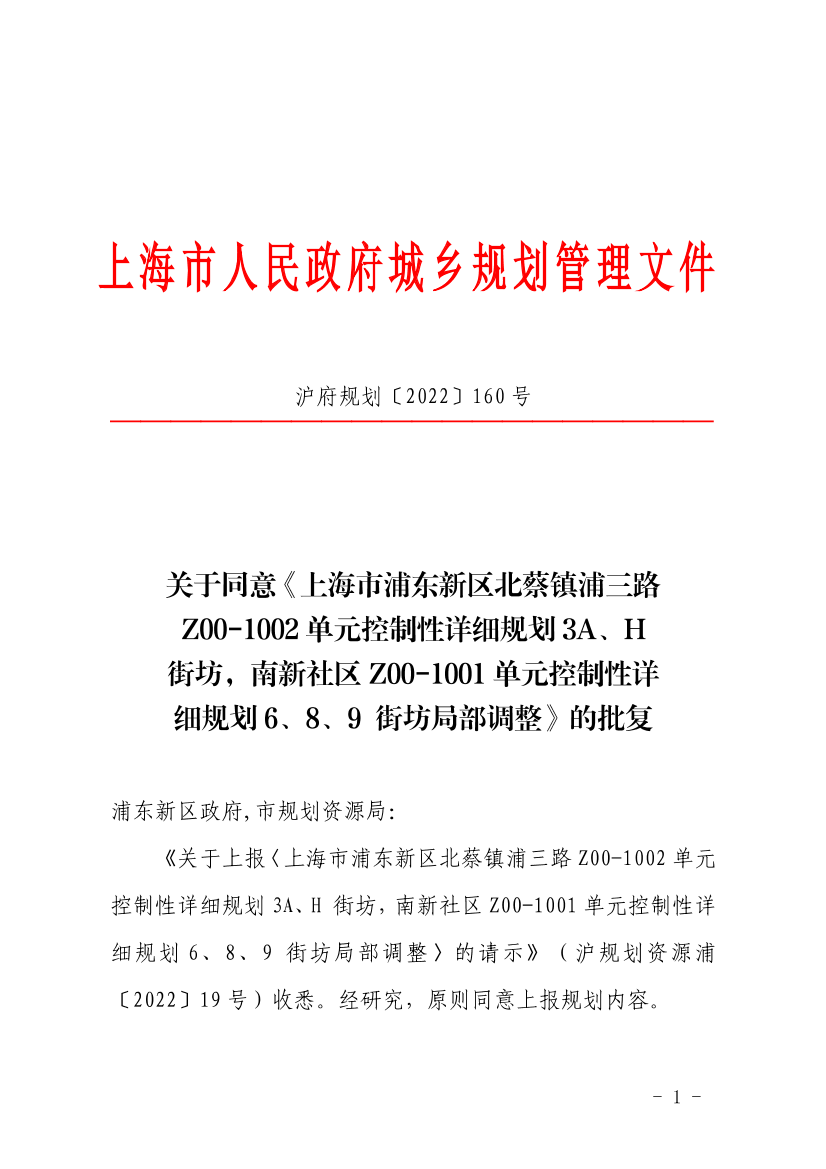 《关于上报〈上海市浦东新区北蔡镇浦三路Z00-1002单元控制性详细规划3A、H 街坊,南新社区Z00-1001单元控制性详细规划6、8、9 街坊局部调整〉的请示》(沪规划资源浦〔2022〕19号)收悉。经研究,原则同意上报规划内容。