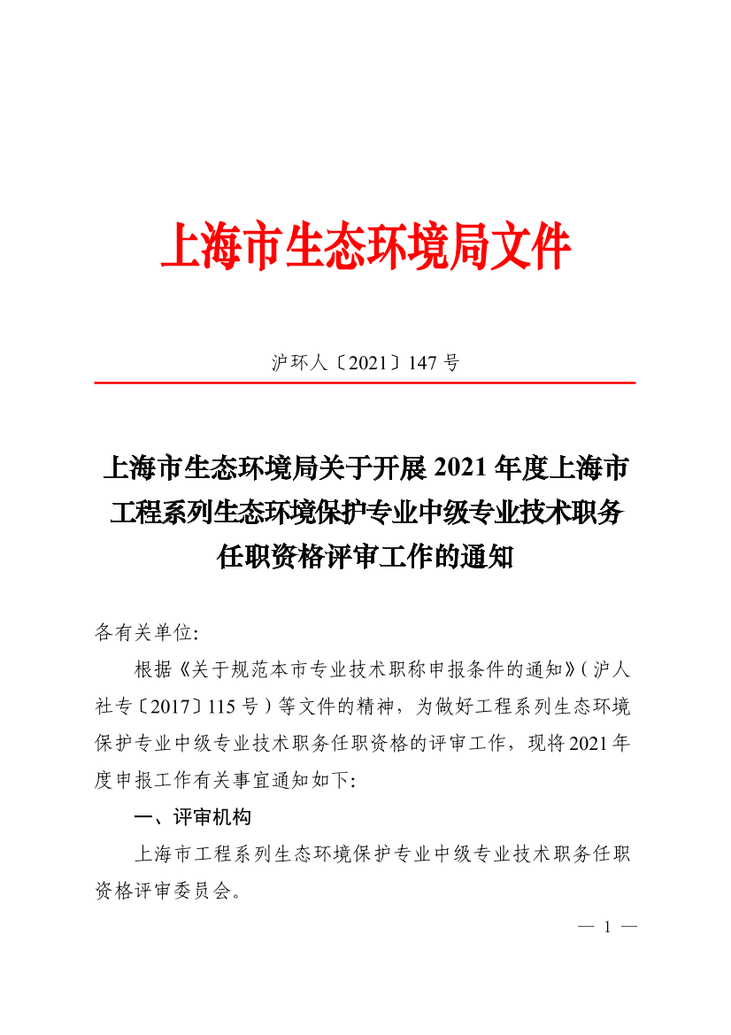 根据《关于规范本市专业技术职称申报条件的通知》(沪人社专〔2017〕115号)等文件的精神,为做好工程系列生态环境保护专业中级专业技术职务任职资格的评审工作,现将2021年度申报工作有关事宜通知如下: